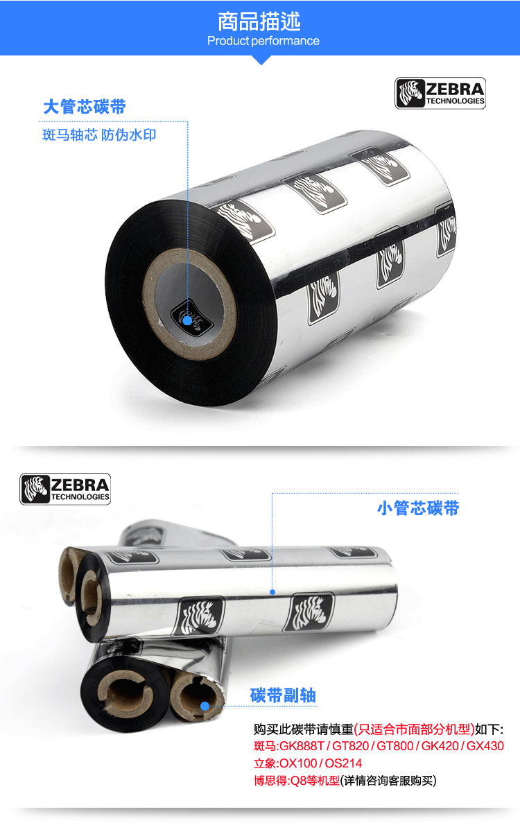 • 斑馬(ZEBRA)碳帶 全樹脂 臘基 混合基 色帶 標(biāo)簽機(jī)/條碼打印機(jī)專用碳帶