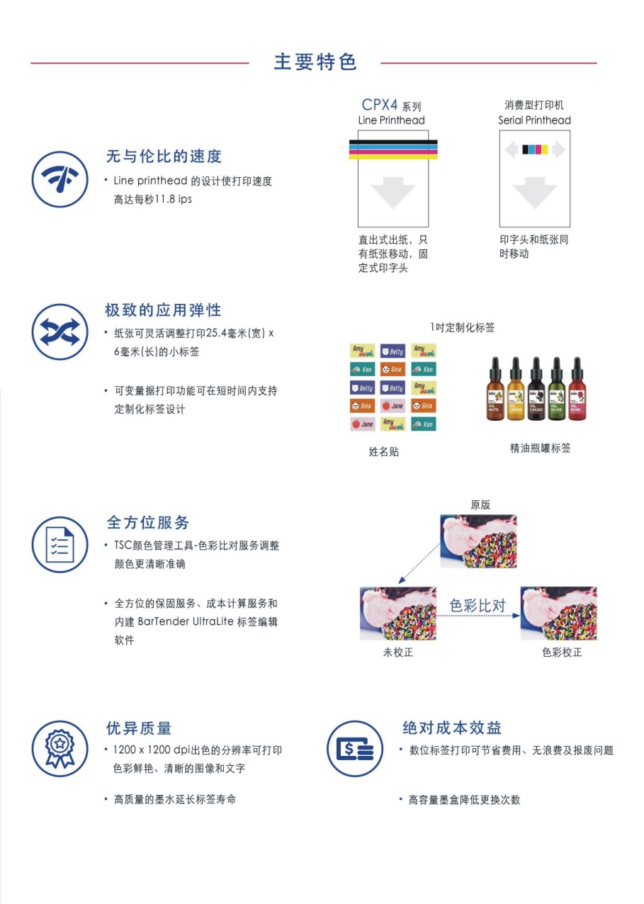 ?打印速度最快可達(dá)每秒11.8 ips ?最高分辨率1200 x 1200 dpi ?可調(diào)整紙張寬度1 英寸到4.72 英寸之間 ?TSC顏色管理工具可 精確比對(duì)顏色?一年保固 ?支持多種紙張類型 ?高速和高效能的USB和以太網(wǎng)絡(luò)接口 ?高容量墨盒